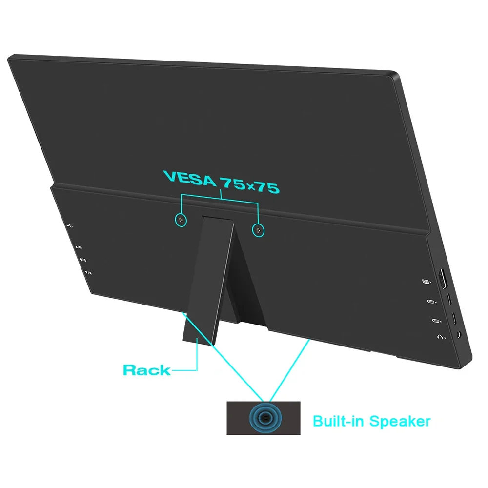 1. The portable monitor can be paired with 75x75mm VESA bracket, can be hung on the wall to save space,built-in speaker.