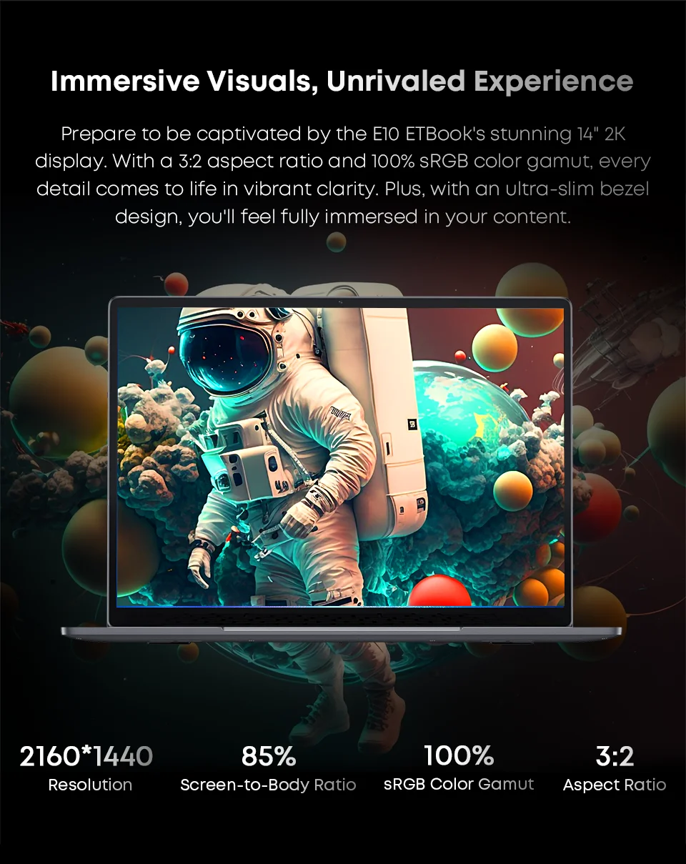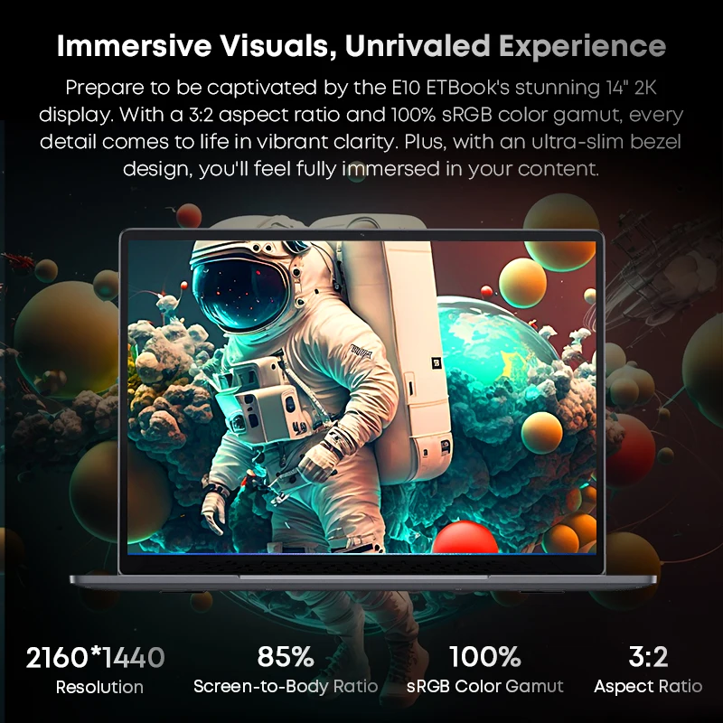 Prepare to be captivated by the El0 ETBook's stunning 14" 2K display. With a 3:2 aspect ratio and 100% sReB color gamut, every detail comes to life in vibrant clarity. Plus, with an ultra-slim bezel design, you'll feel fully immersed in your content.