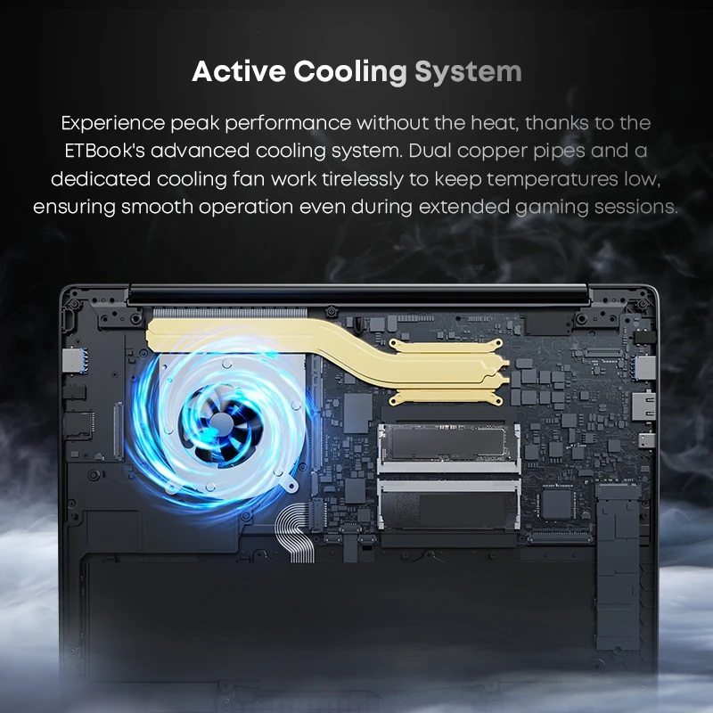 Experience peak performance without the heat, thanks to the ETBook's advanced cooling system. Dual copper pipes and a dedicated cooling fan work tirelessly to keep temperatures low,ensuring smooth operation even during extended gaming sessions.