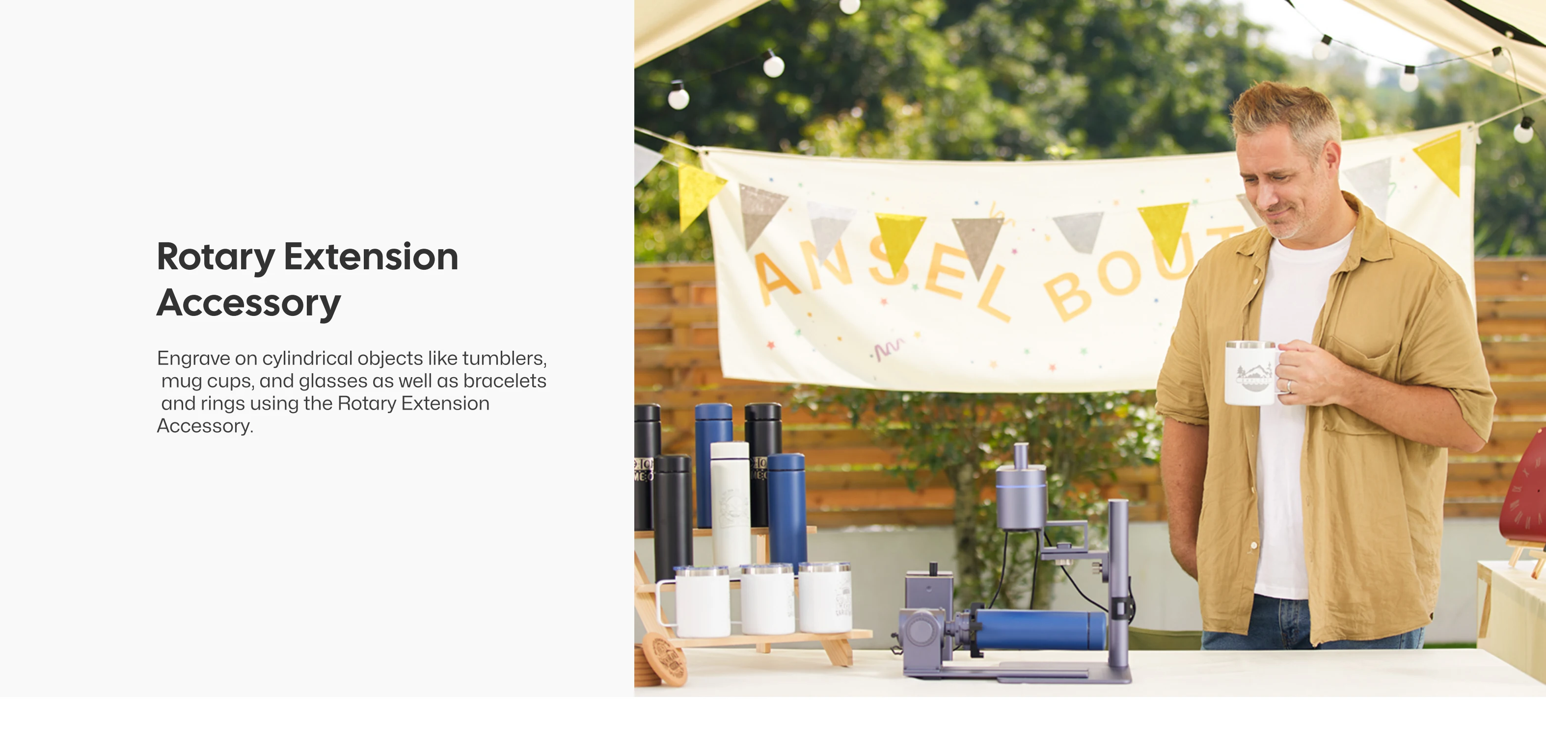 3:Complete Rotary Solution for Curved Surfaces: Professional rotary kit engraves Ø0-145mm items with 3° accuracy. Includes industrial-grade clamps – 56% faster setup than basic rotary attachments.Multi-Industrial Material Mastery: Cut 8mm wood/5mm acrylic.