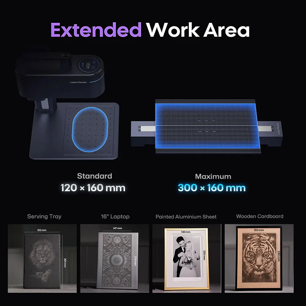 1:Industry-Leading Expandable Workspace (160x300mm): Dual infrared + diode lasers handle 10+ materials simultaneously. Slide extension creates 2.6x larger area than standard engravers – perfect for batch engraving jewelry & plaques.