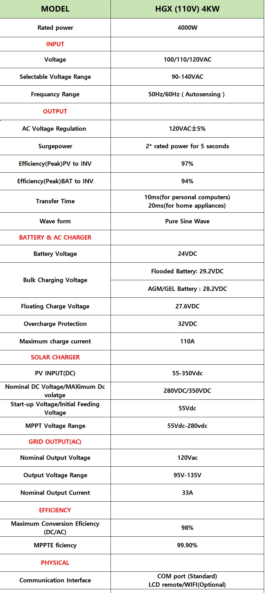 140A MPPT Solar Charging Inverter,High PV input voltage range of 55~350VDC ,AC output voltage 110-120VAC,max 5600W solar charge,50/60HZ frequency, Battery voltage 24v, run without battery, 6.25 inch LCD display and touchable buttons, Cold restart function.
